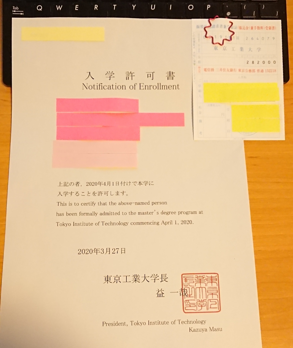 本日、3月29日(日)郵送にて入学許可書を受け取りました。